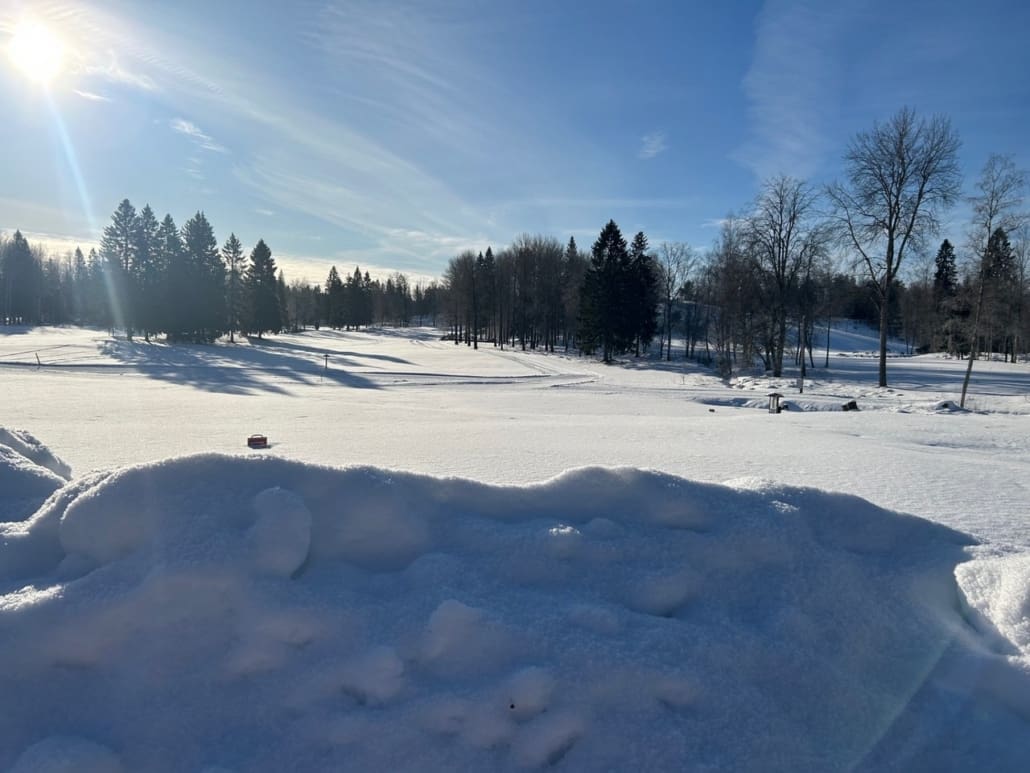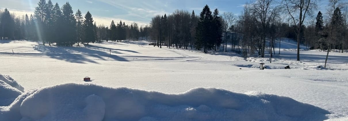 I väntan på golfsäsongen kan vi rekommendera fantastiska skidspår på golfbanan. Du kan åka 4 km eller lite längre om du vill det, en bra aktivitet i väntan på gröna greener. Du kommer också att se spår efter stormen Johannes framfart på några av hålen.